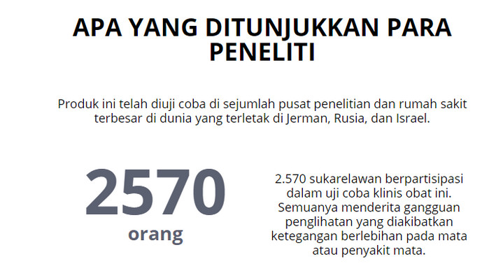 Konfirmasi penting bahwa kapsul penglihatan Eyelab benar-benar berfungsi adalah hasil uji klinis skala besar, yang dilakukan atas dasar salah satu lembaga penelitian terbesar. Percobaan berlangsung selama 9 bulan. Selama ini, 13 ribu relawan ikut ambil bagian. Pemeriksaan kontrol menunjukkan hasil yang luar biasa.